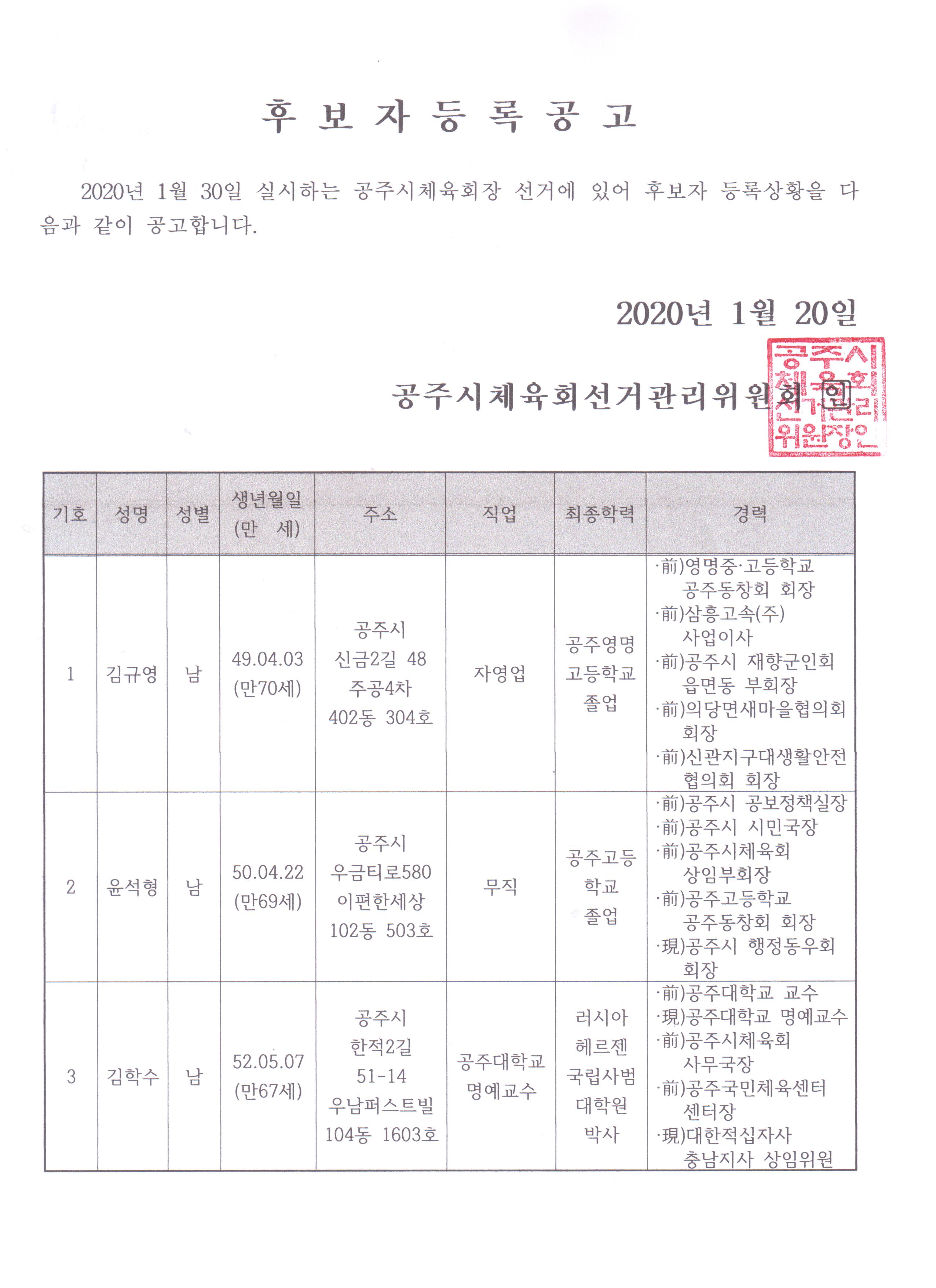 °øÁÖ½ÃüÀ°È¸Àå ¼±°Å Èĺ¸ÀÚ µî·Ï °ø°í