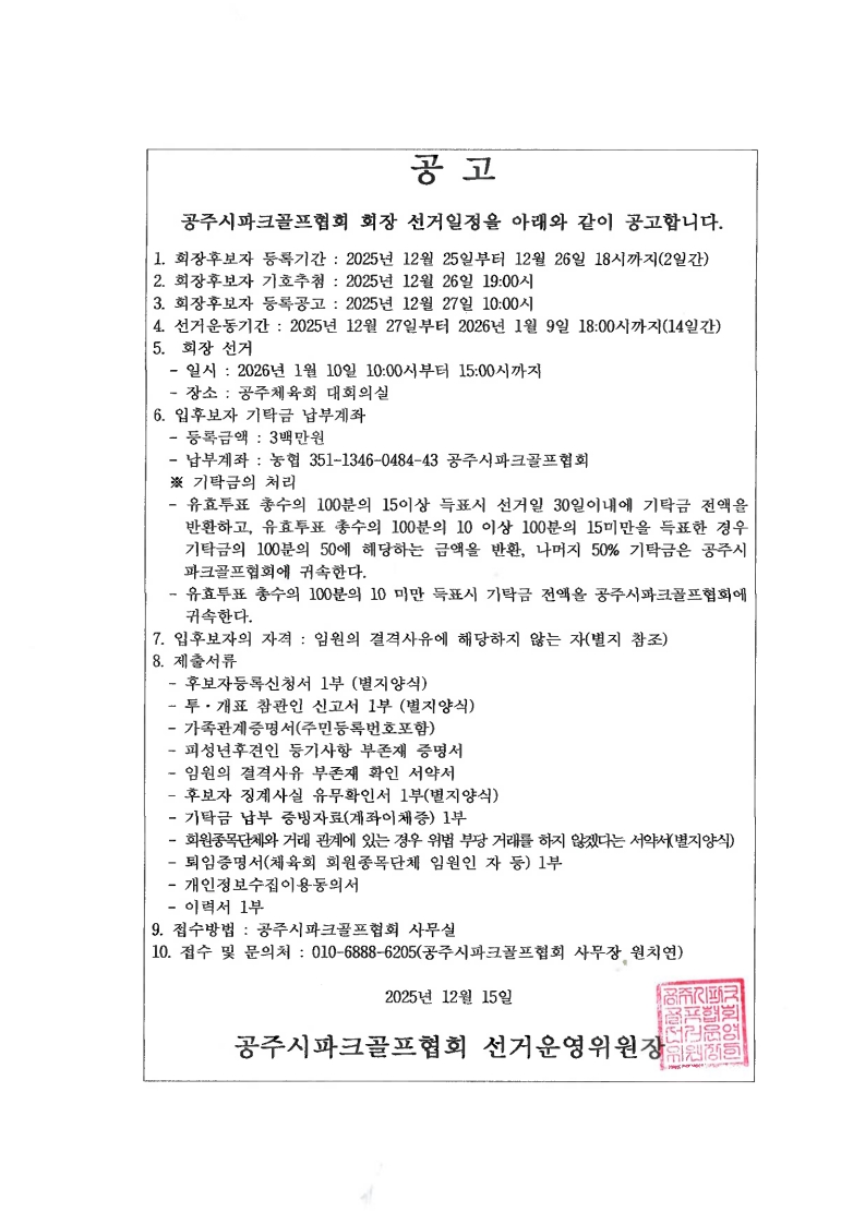 °øÁÖ½ÃÆÄÅ©°ñÇÁÇùȸ ȸÀå ¼±°Å ÀÏÁ¤ °ø°í