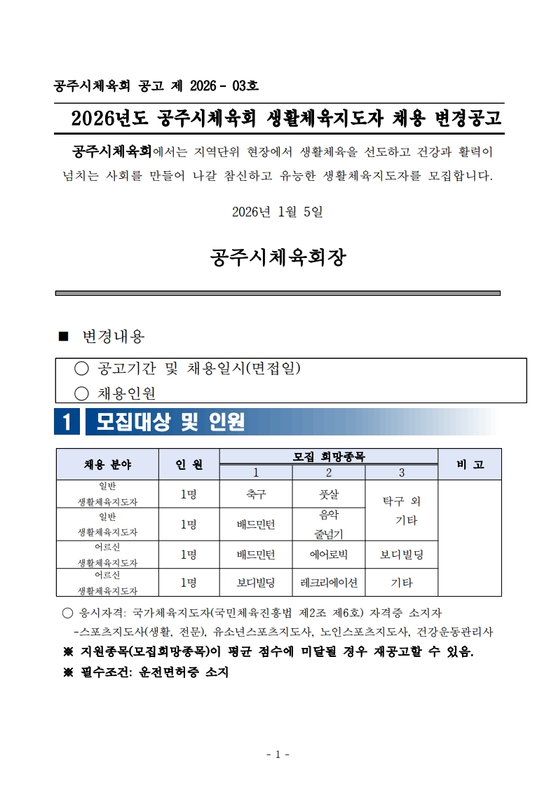 2026 °øÁÖ½ÃüÀ°È¸ »ýȰüÀ°ÁöµµÀÚ Ã¤¿ë º¯°æ °ø°í¹®