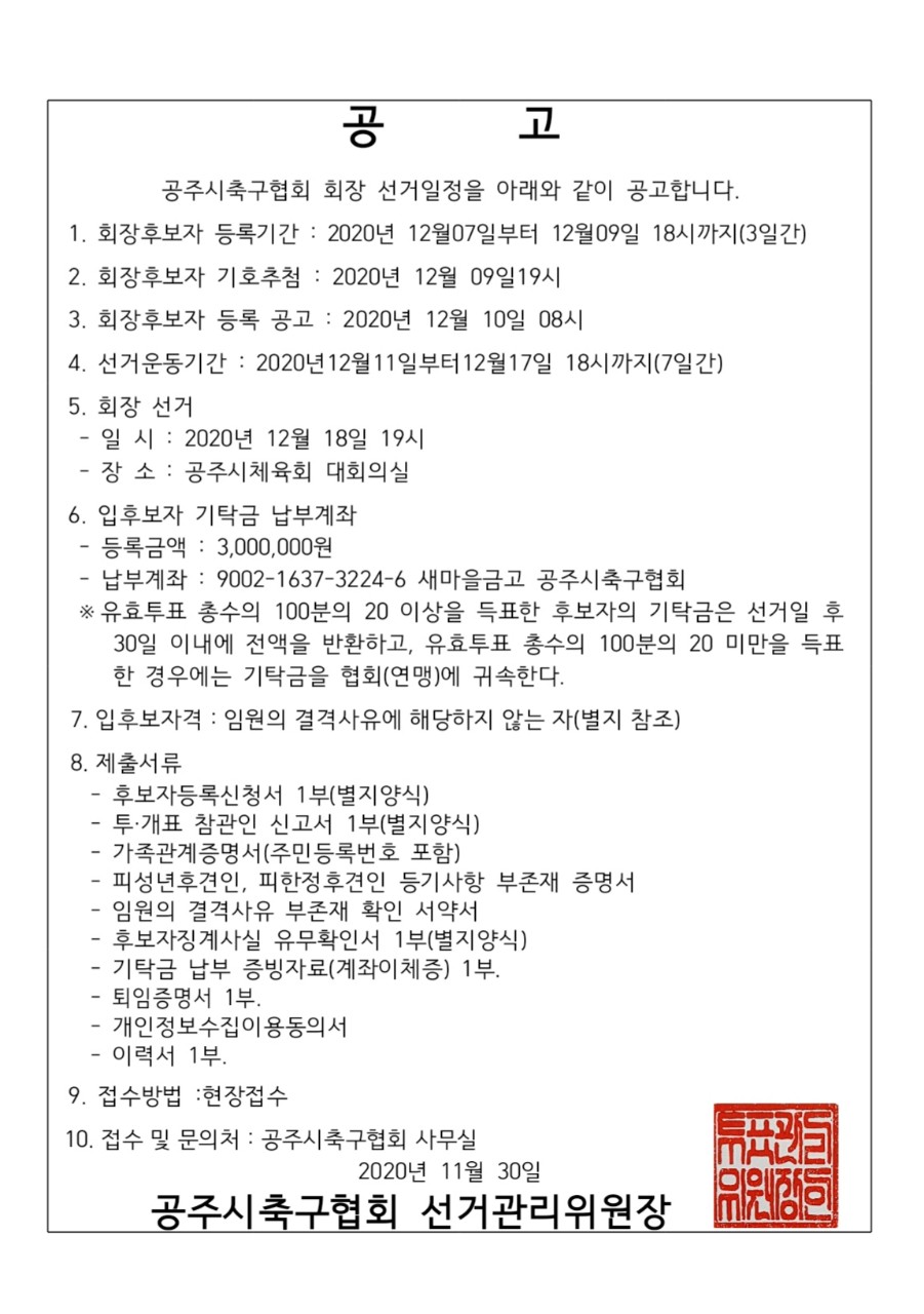 °øÁÖ½ÃÃ౸Çùȸ ȸÀå¼±°Å °ø°í