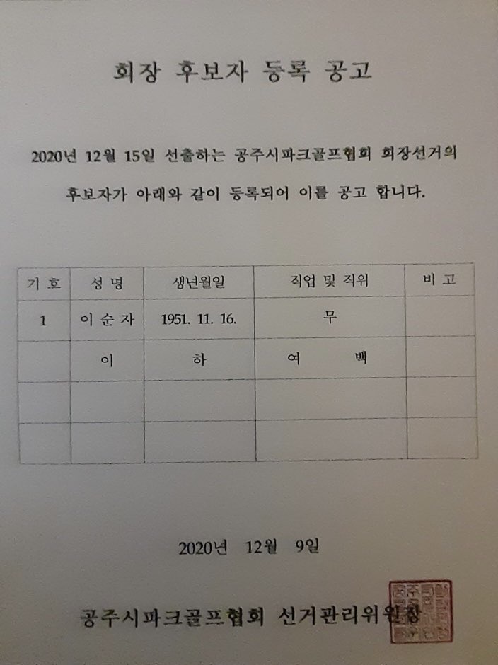 °øÁÖ½ÃÆÄÅ©°ñÇÁÇùȸ ȸÀå Èĺ¸ÀÚ µî·Ï °ø°í