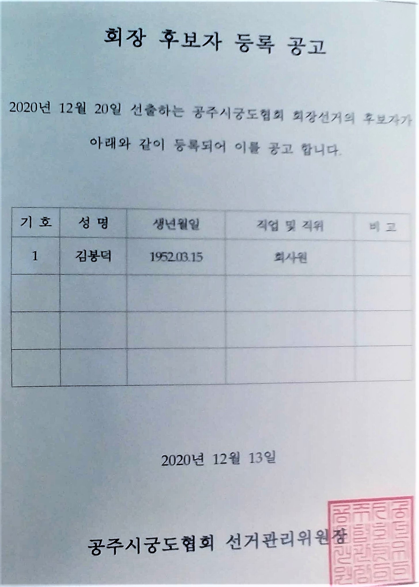 °øÁֽñõµÇùȸ ȸÀå Èĺ¸ÀÚ µî·Ï °ø°í